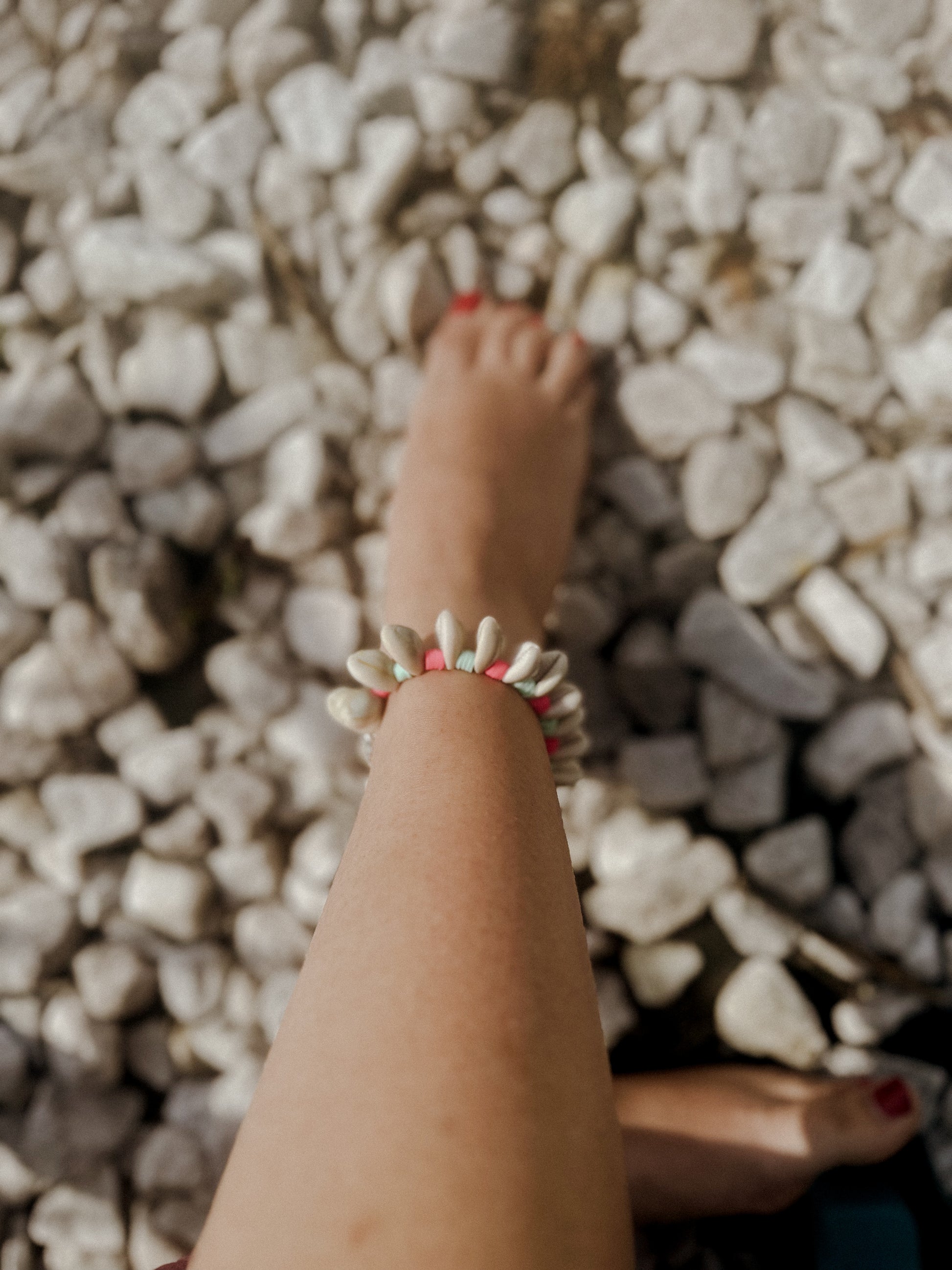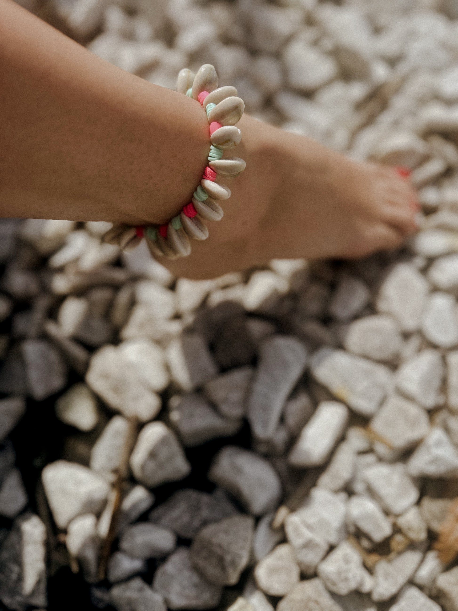 Hand strung seashell anklet paired with silicone pink and sea foam silicone beads