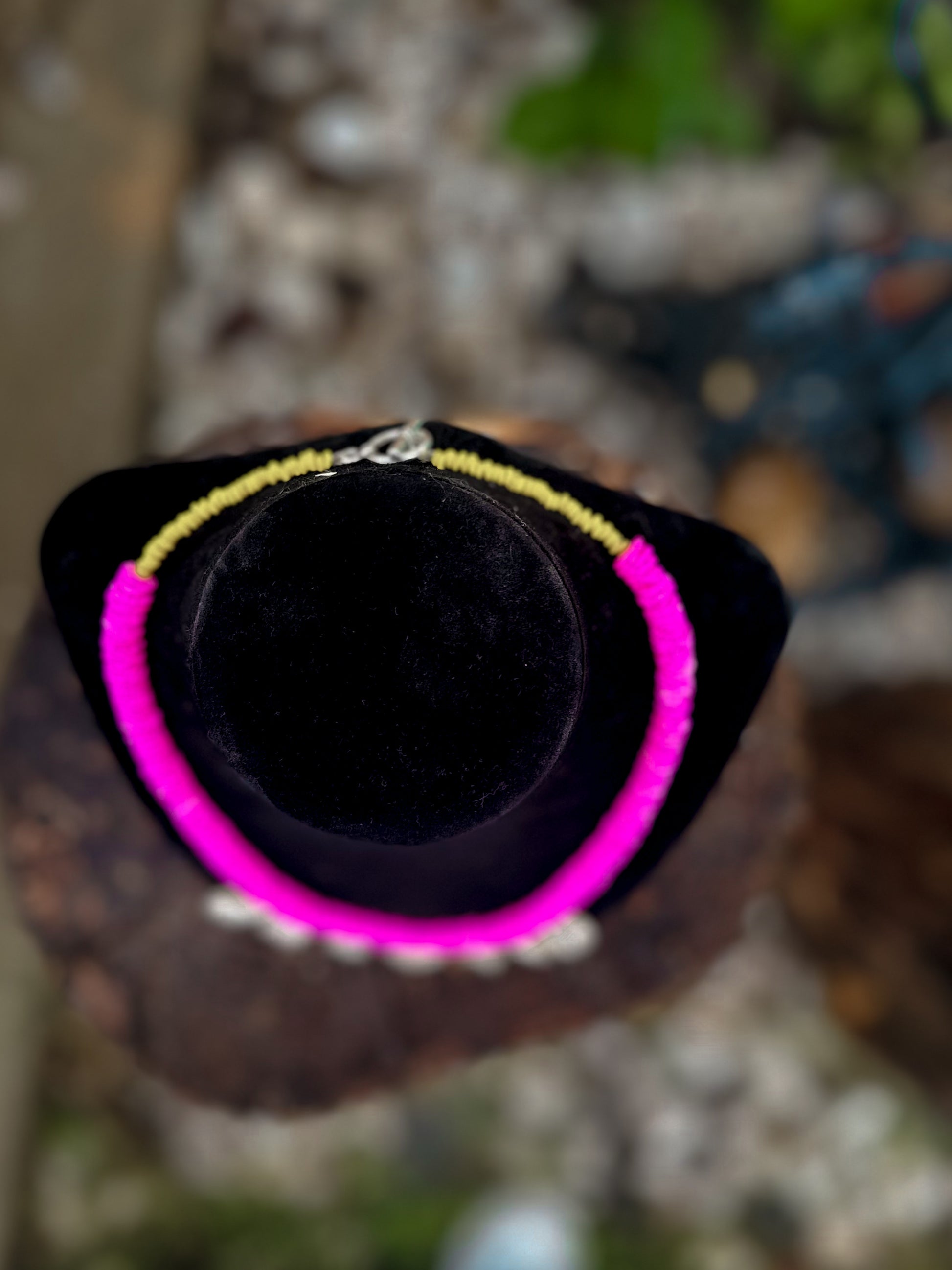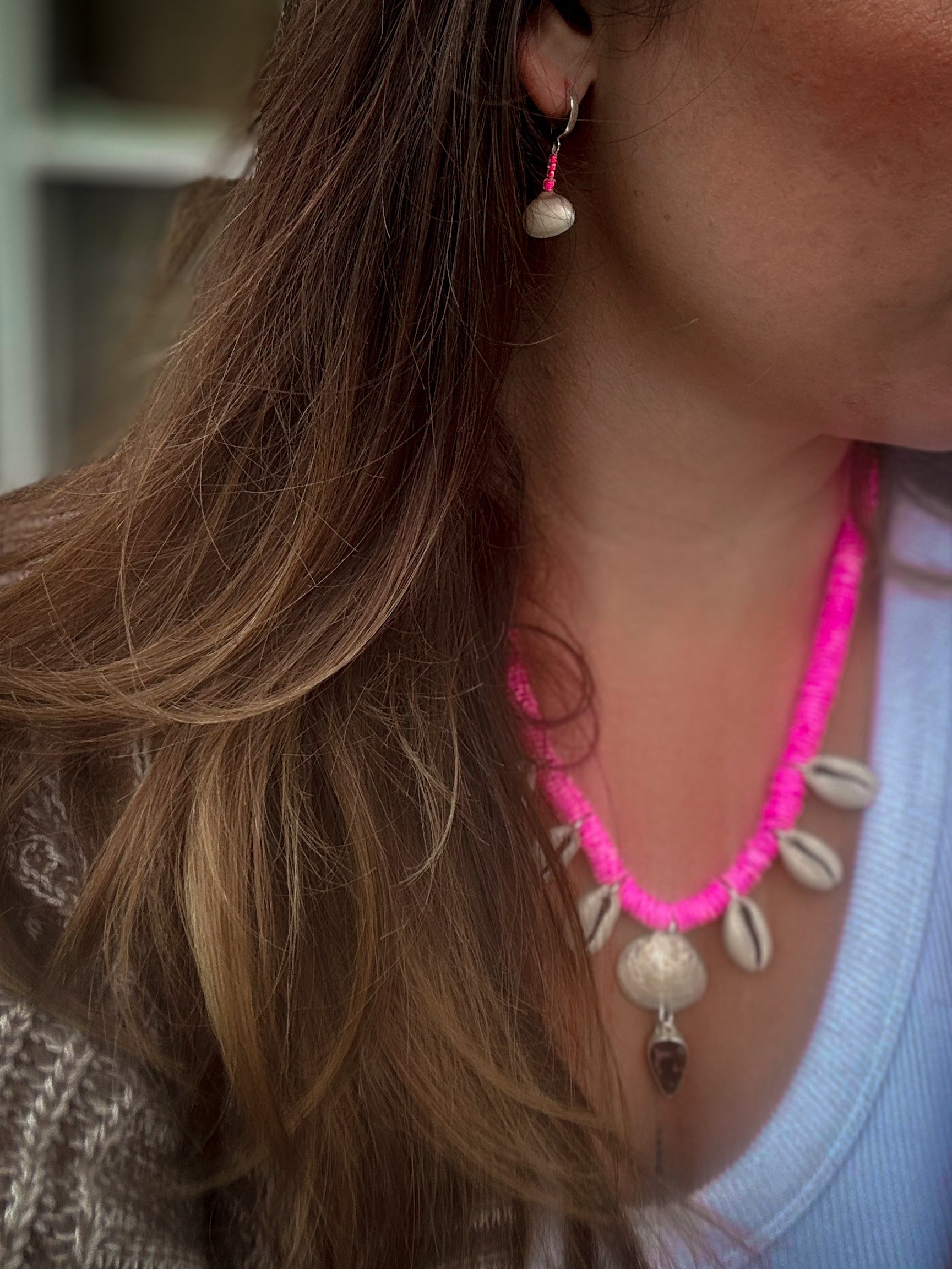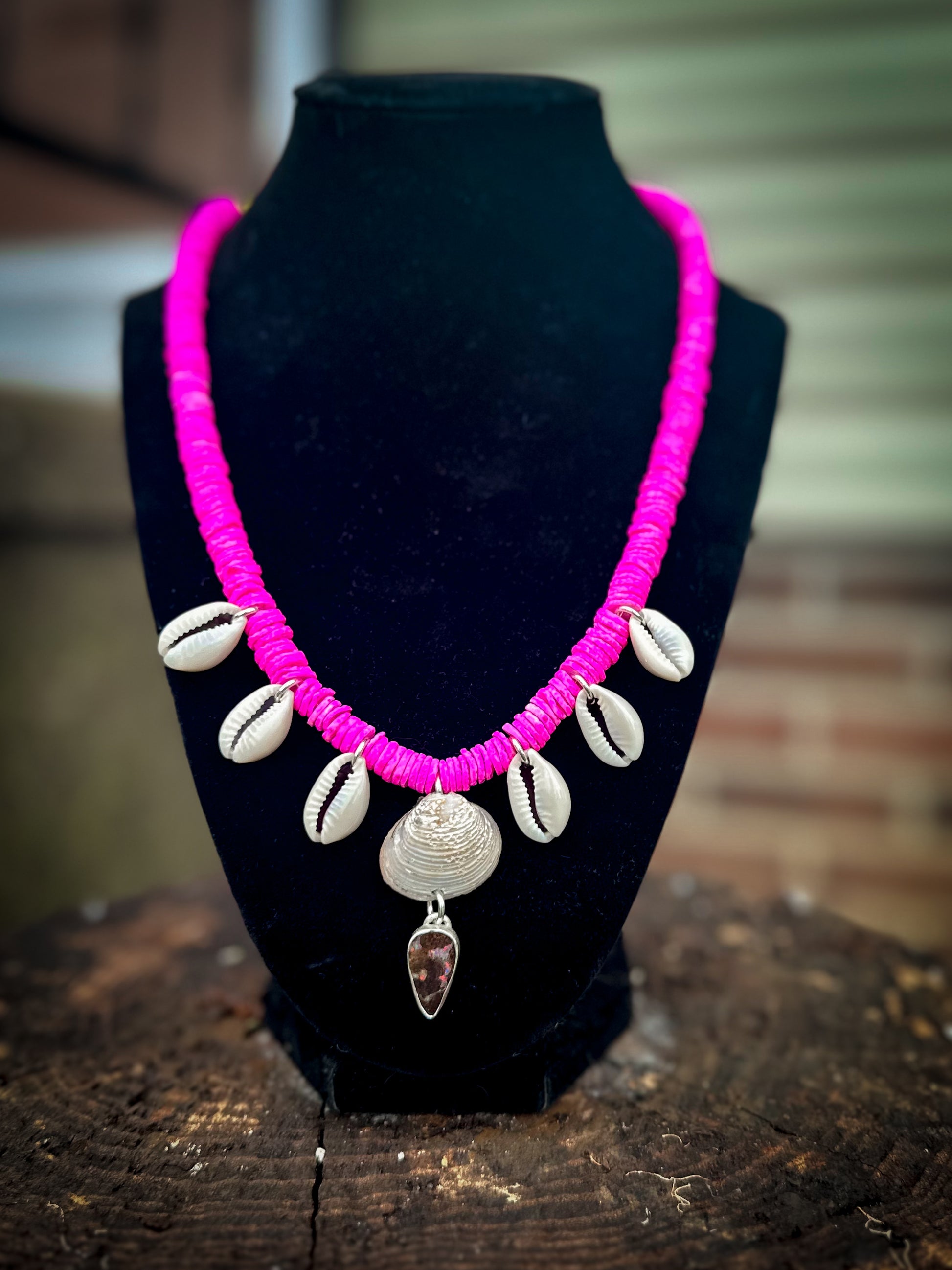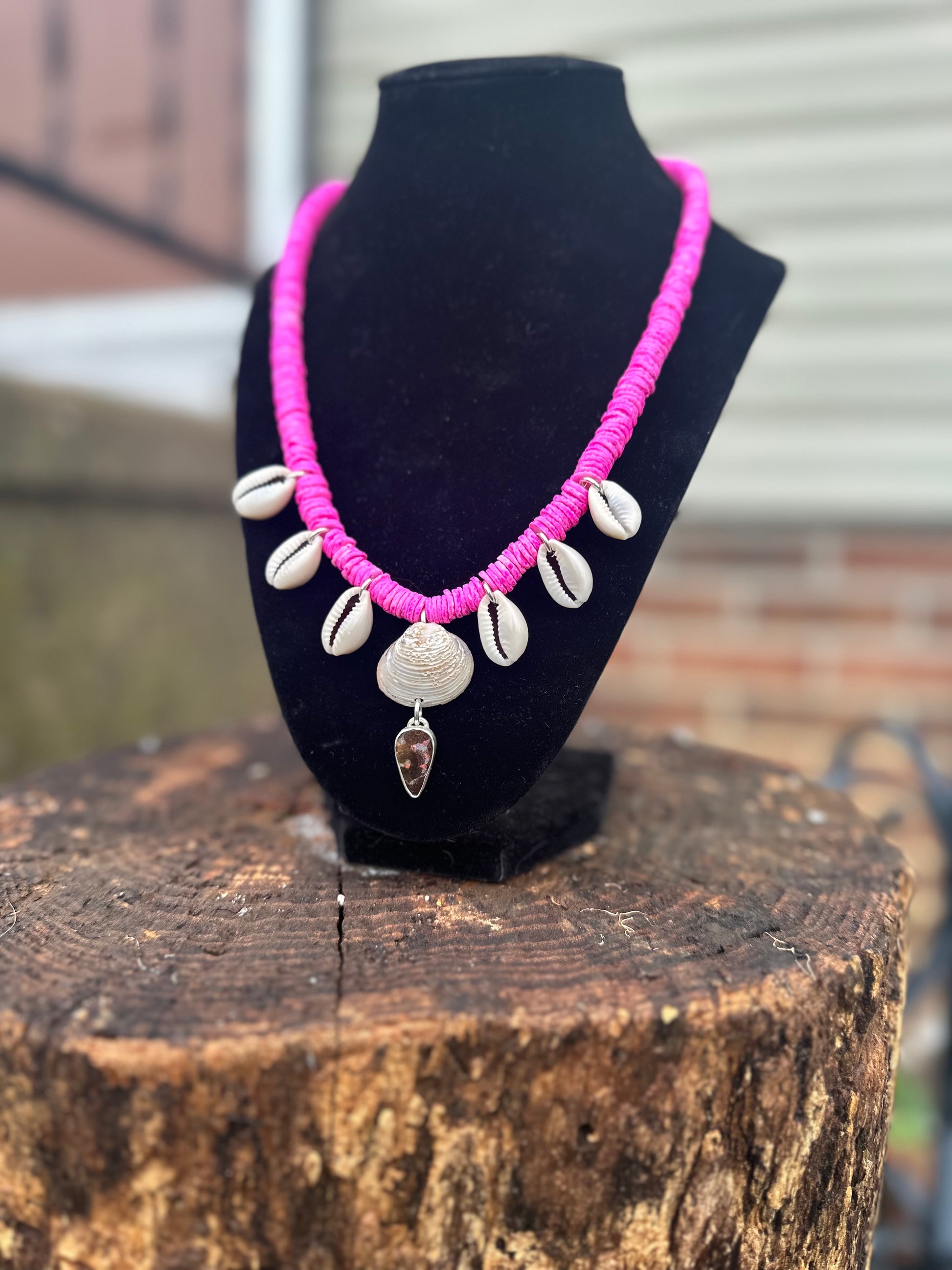 Hand strung with a vibrant pink and yellow beads with seashell accents.