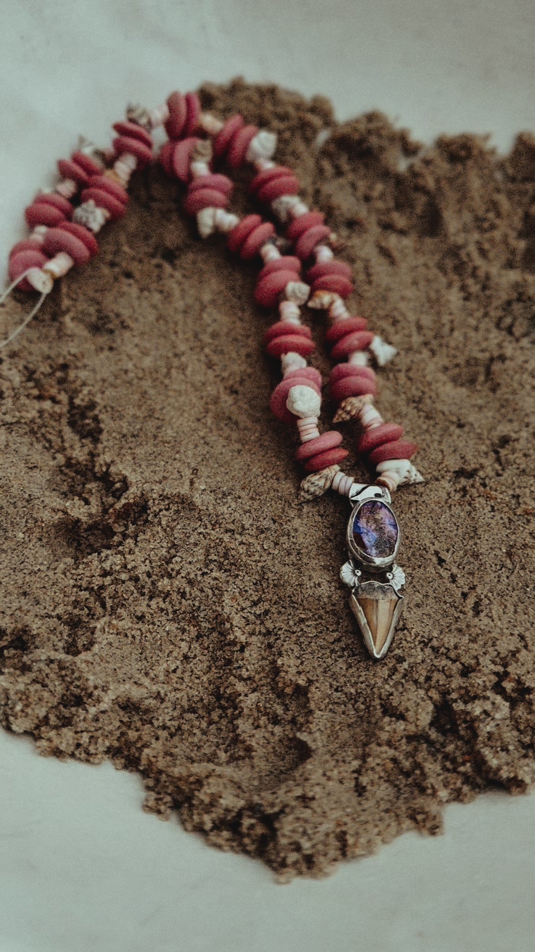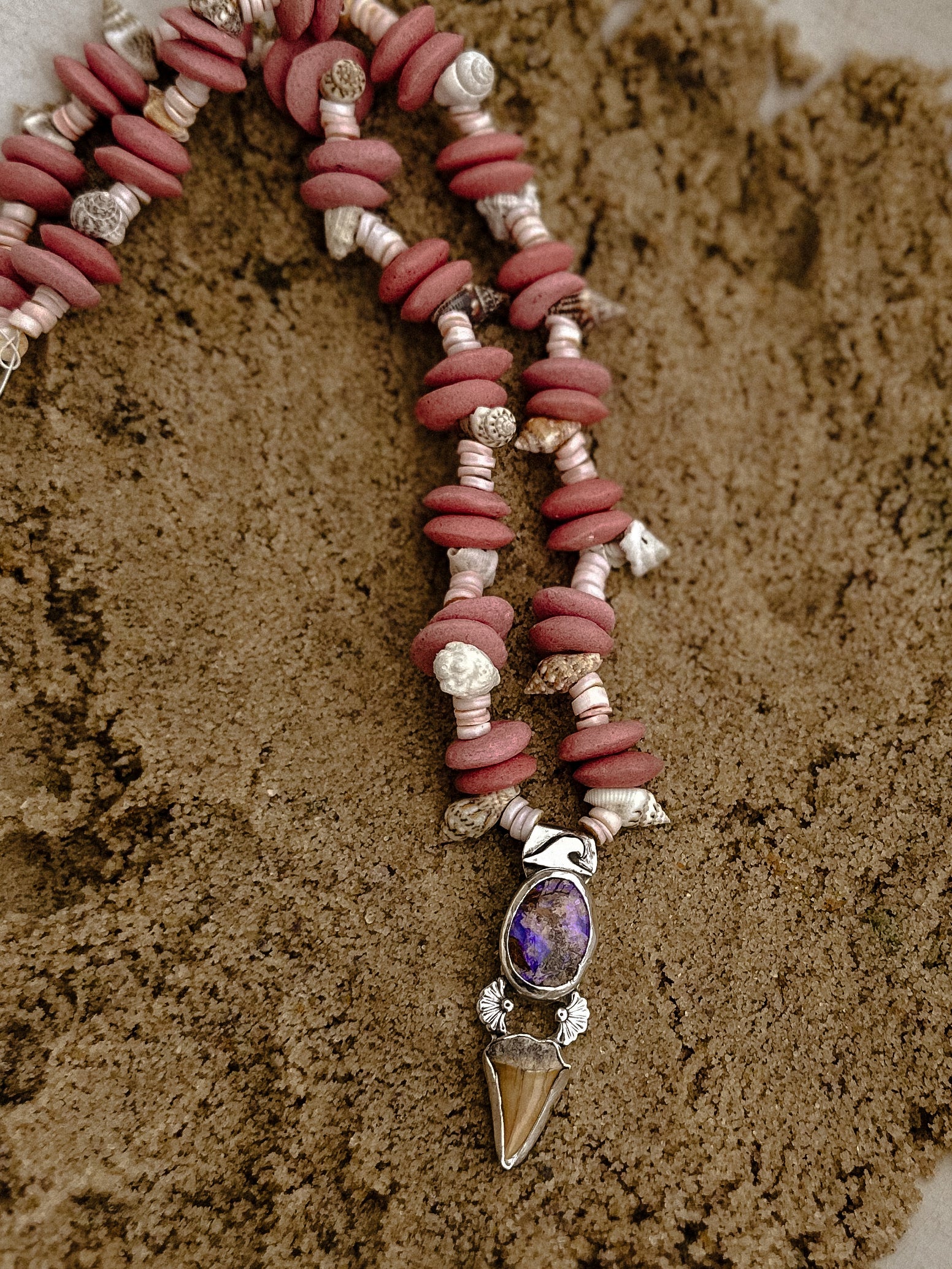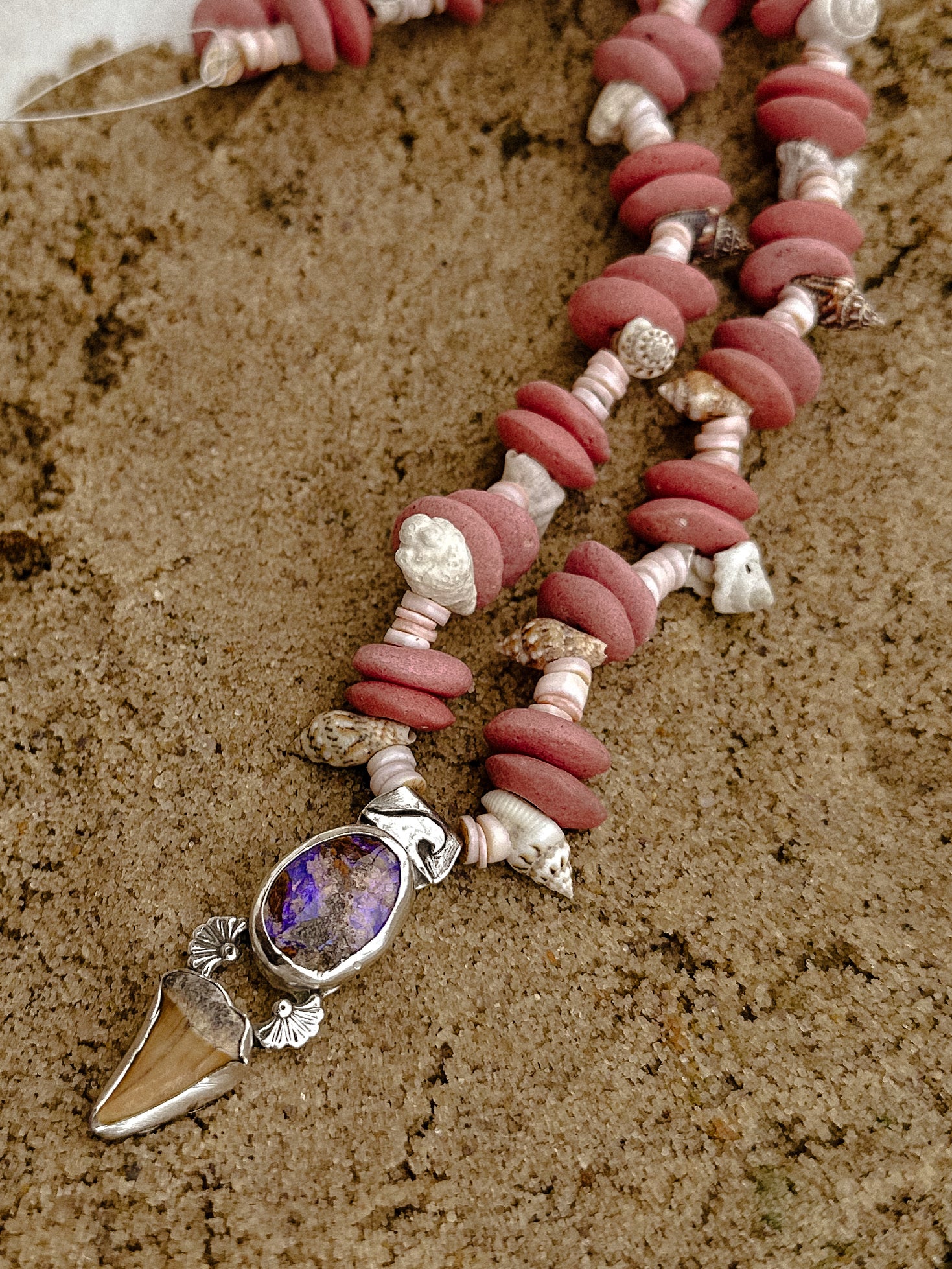 Hand strung with hashi, pink fruit loops ( 😂 ) and seashells.