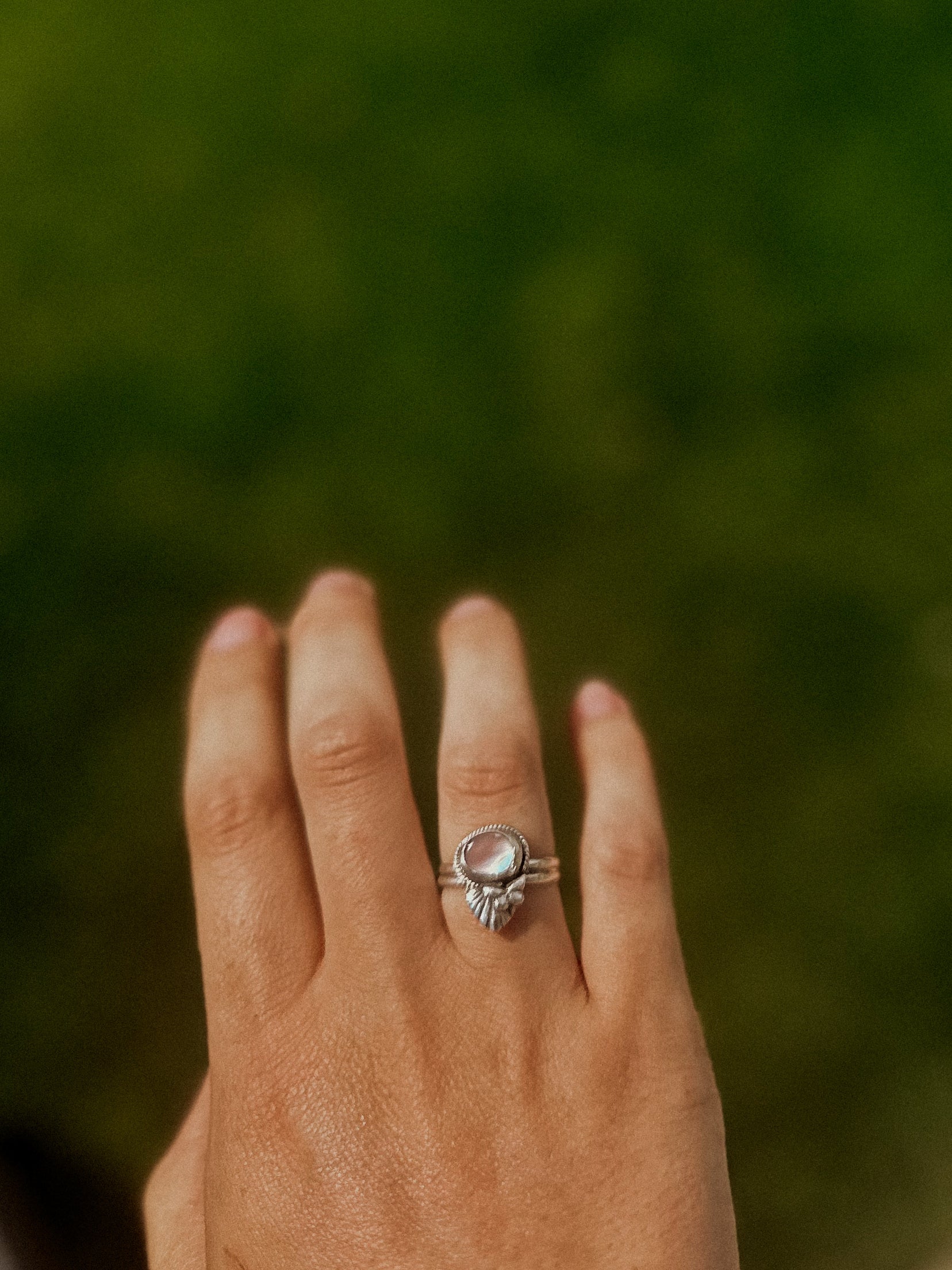 Handcrafted from sterling silver this soft pink moonstone ring is paired with the cutest butterfly embellishment.