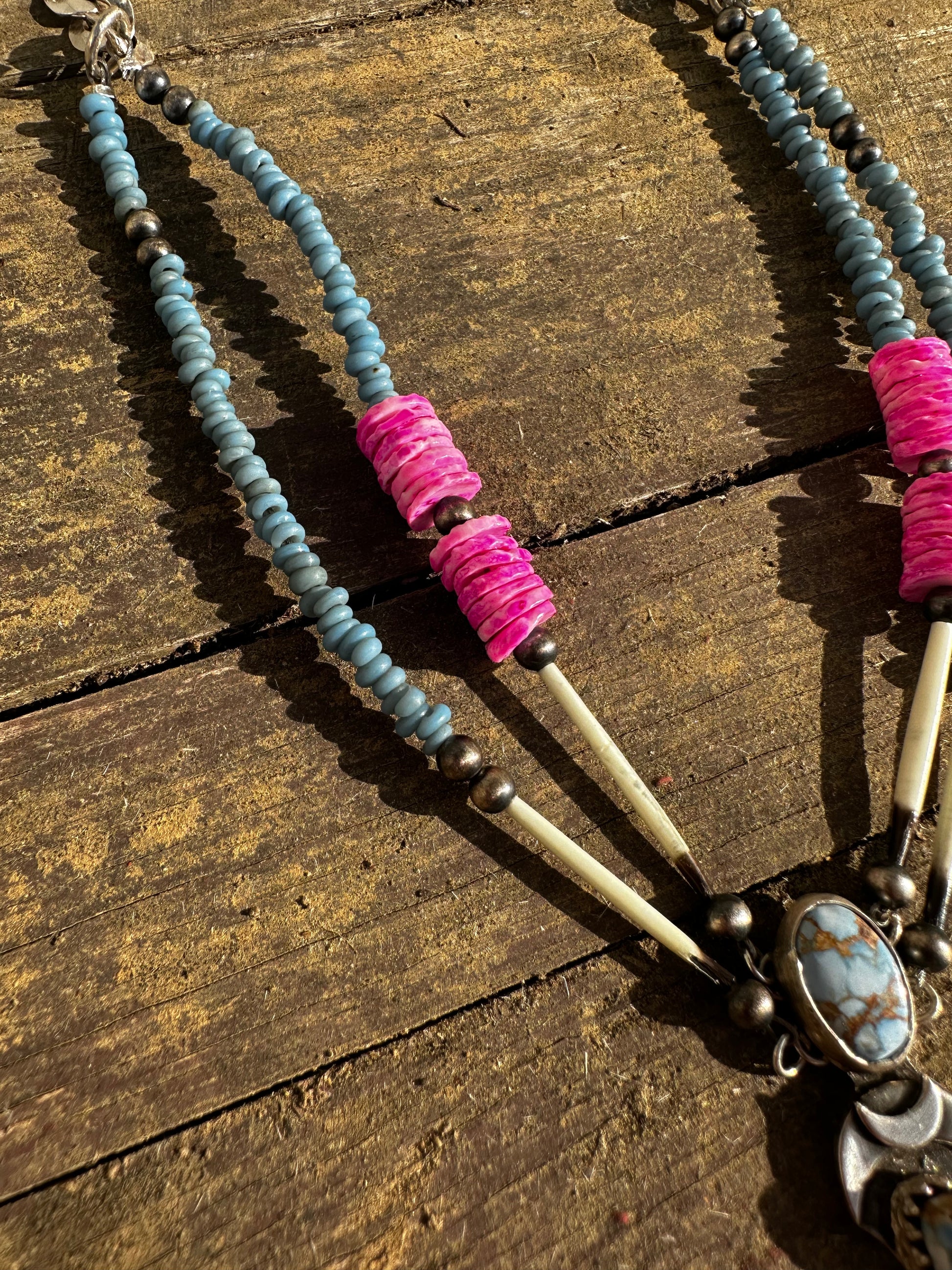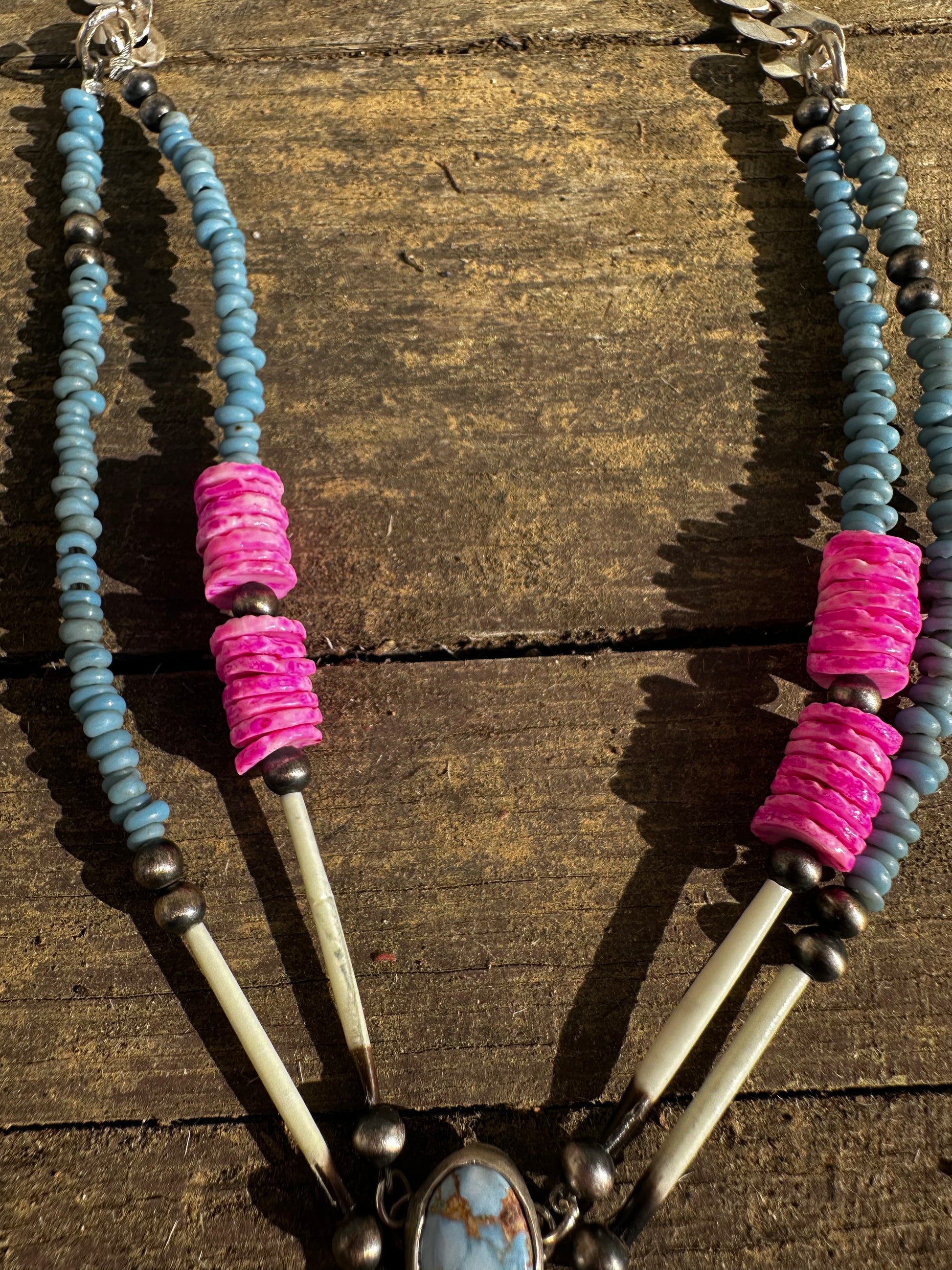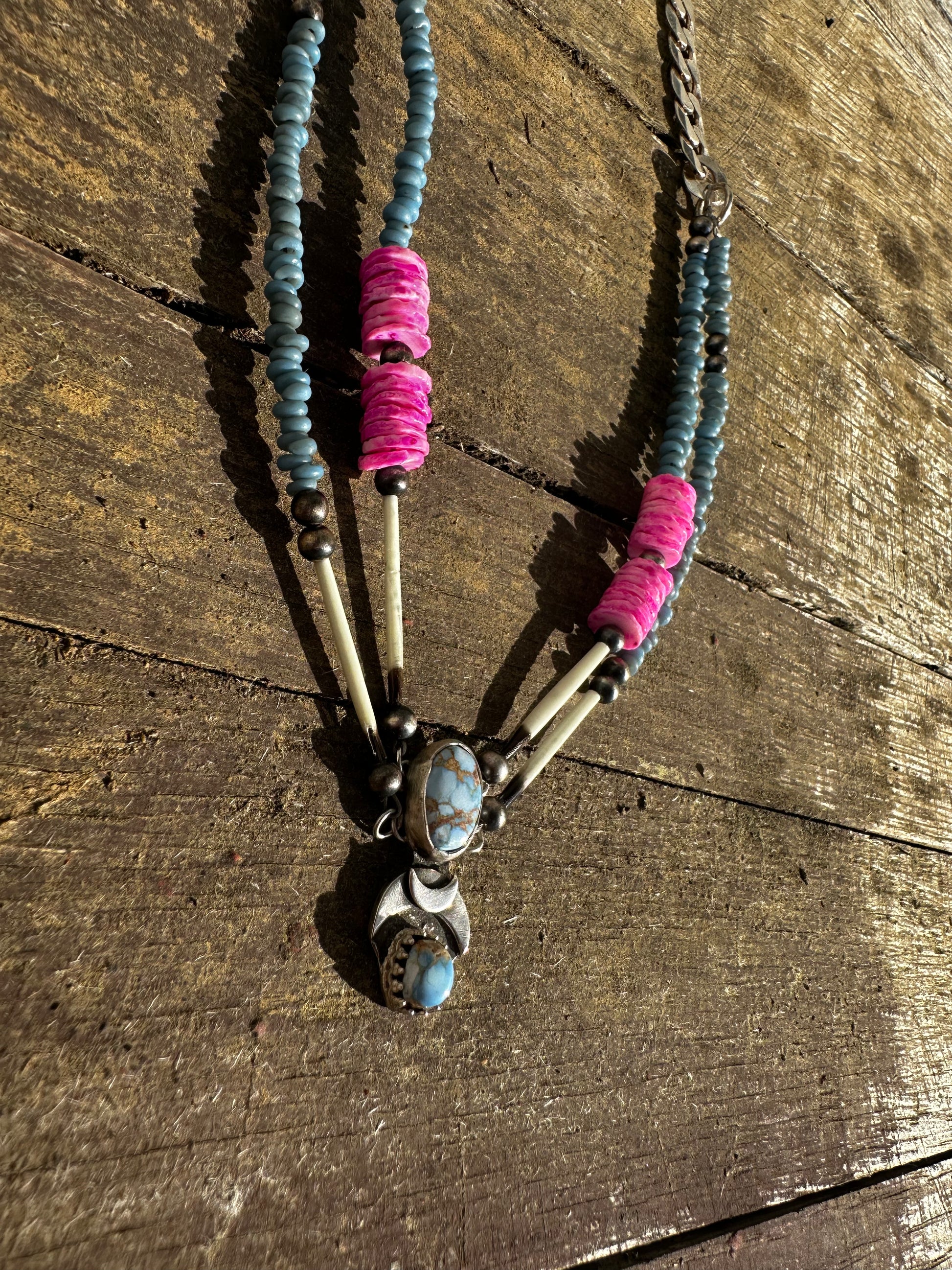 This one of a kind necklace is handmade with Sterling silver, Golden Hills Turquoise, Navajo pearls, porcupine quills and beautifully vibrant pink & blue beads. The perfect mix of a western ocean 🌊.