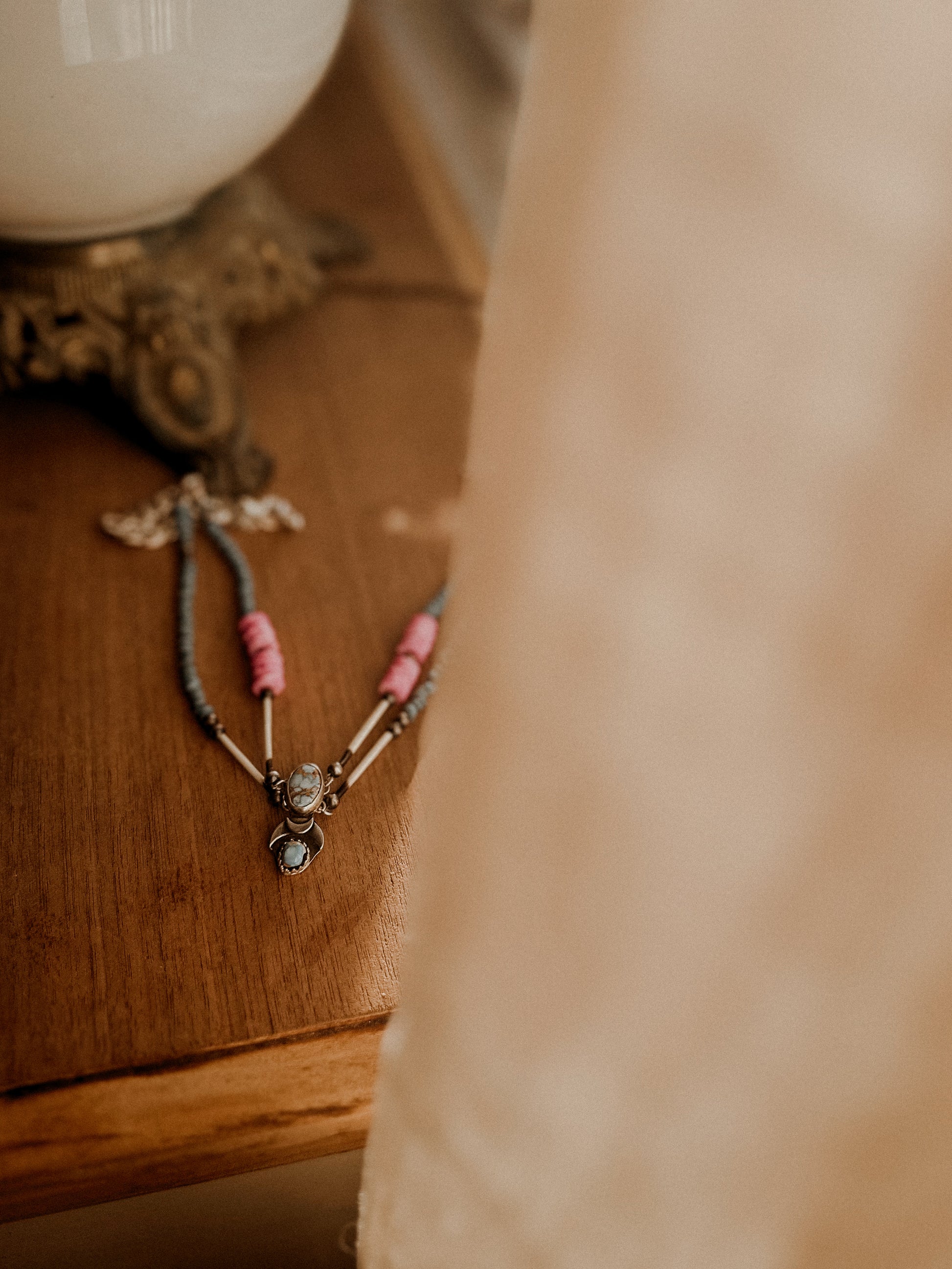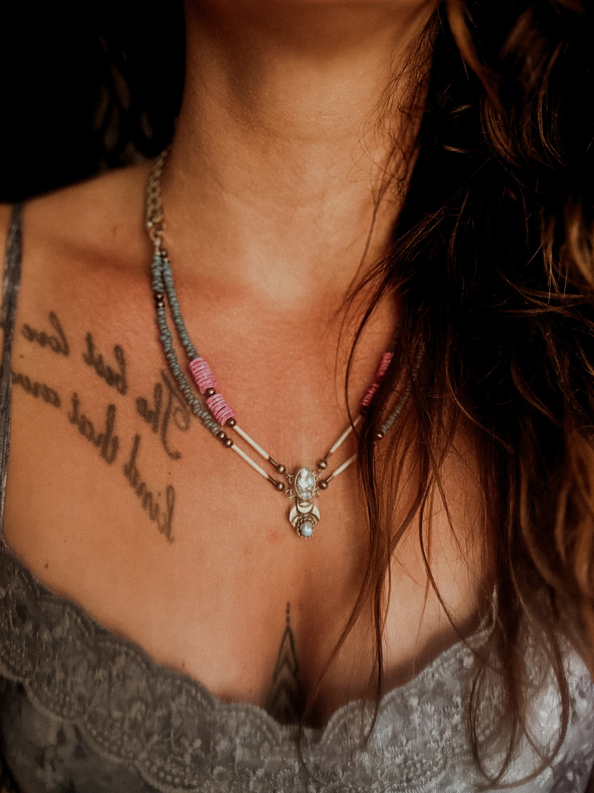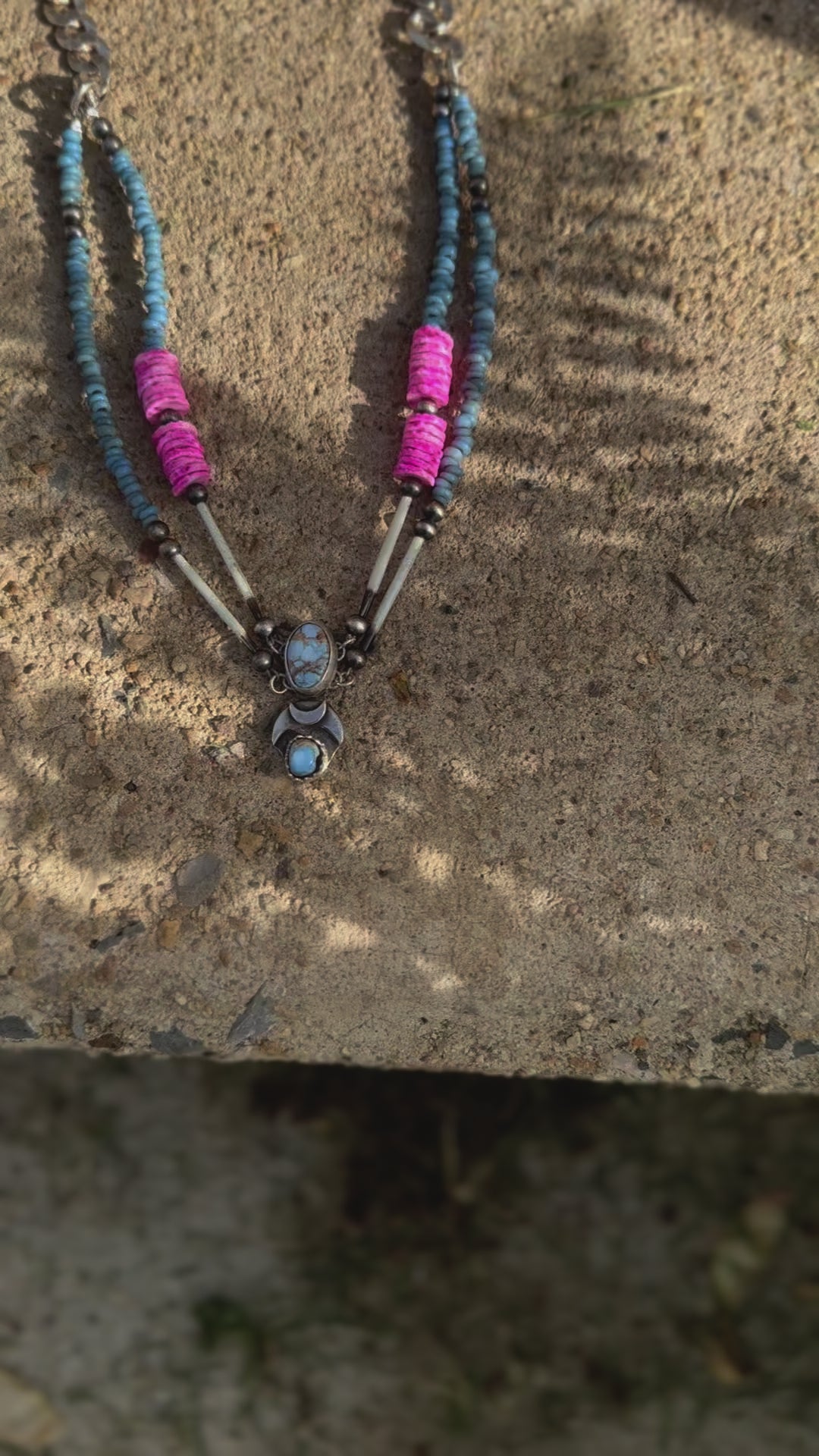 This one of a kind necklace is handmade with Sterling silver, Golden Hills Turquoise, Navajo pearls, porcupine quills and beautifully vibrant pink & blue beads. The perfect mix of a western ocean 🌊.